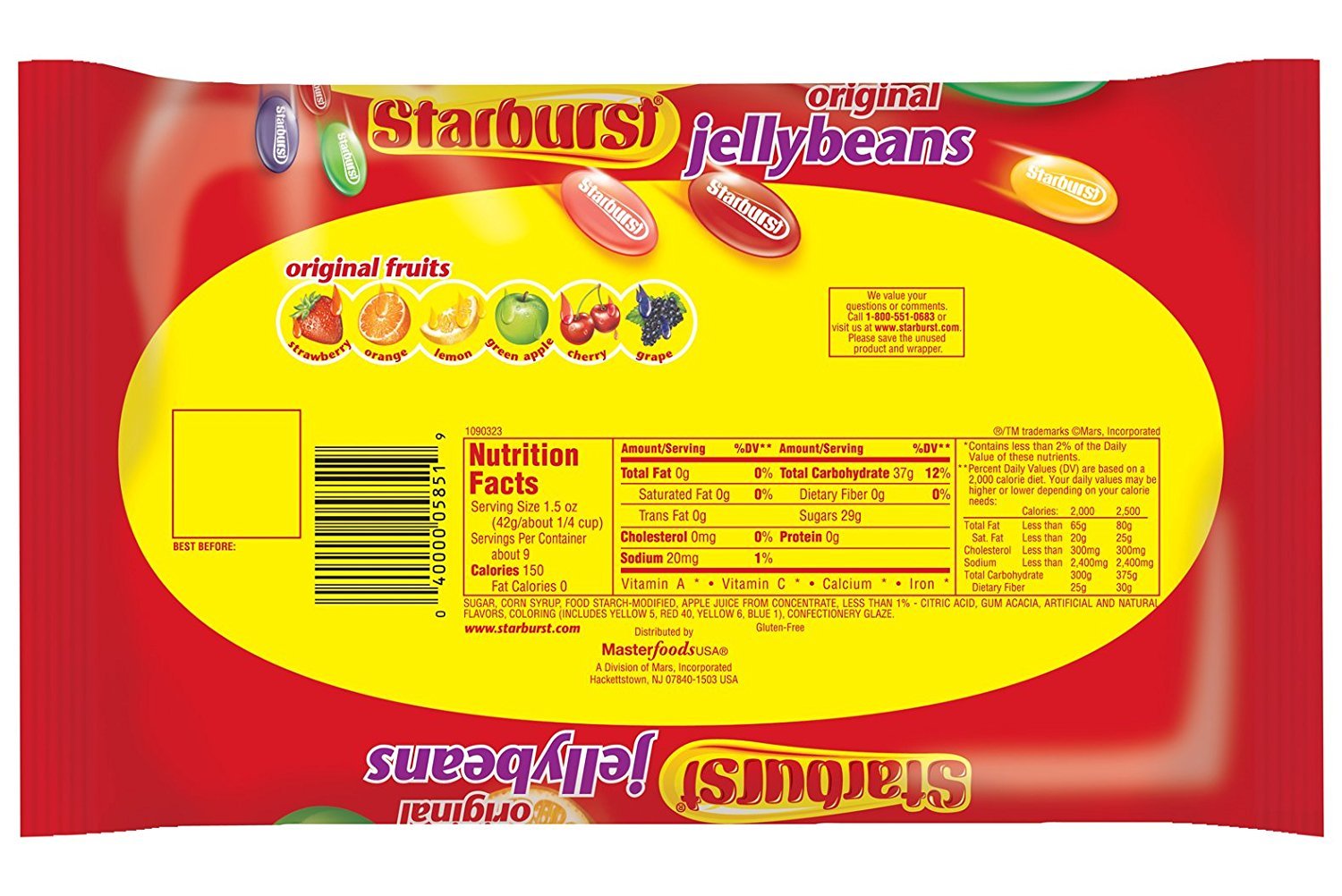 Starburst Jellybeans, Original: Calories, Nutrition ... - Fooducate Personalized health review for Starburst Jellybeans, Original: 100 calories, nutrition grade (D plus), problematic ingredients, and more. Learn the good & bad for 250,000+ products. ... Worth every calorie. 1 likes meufilho21. Apr 12 2019. I only eat the pink ones live it. No rating. Deelgp40. Jun 20 2019. I love how Fooducate gives ... Calories in Starburst Jelly Beans, Original - Nutritional Information ... Nutritional Information, Diet Info and Calories in Jelly Beans, Original from Starburst Additional Serving Size Recommendations Nutrition Facts Serving Size 40 grams Amount Per Serving Calories 140 Calories from Fat 0 % Daily Value * Total Fat 0g 0% Saturated Fat 0g 0% Trans Fat 0g Cholesterol 0mg 0% Sodium 0mg 0% Potassium 0mg 0%