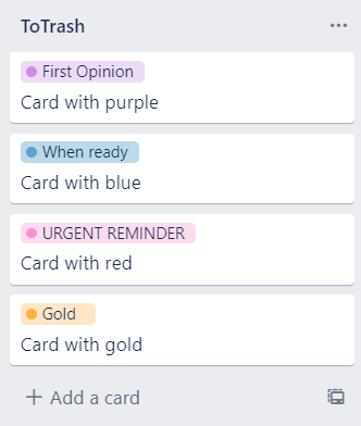 Add labels to cards | Trello | Atlassian Support There are 10 label colors to choose from in Trello, and a colorless label option. A single card can have multiple labels. Colored labels will display on a card's front and back. Colorless labels (represented by the light gray color) will only display on the back of the card. Add a label There are a few ways to add a label to a card: Is there any way to create custom label colors? - Atlassian Community Current set of pre-set colors are too limited when you want to go the extra mile and configure the Trello board 100% solid according to the example use case above. Also, optionally adding/setting custom colors for labels is sort of expected in 2018 - especially from a forward leaning product as Trello. How to change order of color labels? - Atlassian Community No, there's not a way to change the order of labels. Mostly because the labels are all assigned a shortcut key. Esteban López Betancourt Rising Star May 14, 2020. bad answer anyway. Is there a way to suggest this kind of thing to @dev people in order to get a next better version of the software? maybe the ability to disabled shorcuts for ... Card Colors for Trello - Chrome Web Store - Google Chrome Simple extension allowing the selected label colors of cards in Trello to fill the entire card. Settings allow either combing colors of multiple labels by simple rgb base value average or pick the color of the first label. 1.0.0.8 - Fixed issue with changed classes 1.0.0.7 - Reduced CPU load by only updating the DOM when there are changes 1.0.0 ...