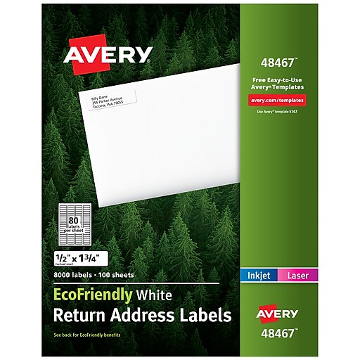 Return address labels (basic format, 80 per page, works with Avery 5167) Create your own return address labels with this basic accessible template. The labels are 1-3/4 x 1/2 inch and work with Avery 5167, 5267, 5667, 5967, 6467, 8167, and 8667. Word.