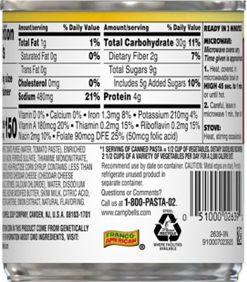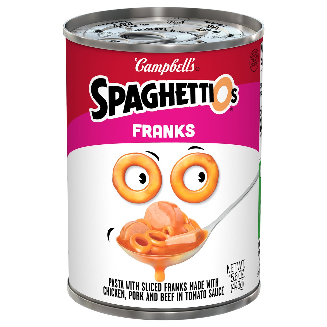 Campbell's Spaghettios Sliced Franks - Shop Pantry Meals at H-E-B Nutrition Facts · Amount Per Serving. Calories. 220 · % Daily Value · Cholesterol. 25mg; 8% · Sodium. 600mg; 26% · Potassium. 370mg; 8% · Calcium. 30mg; 2% · Iron. 1.6 ... Campbell's Original Spaghetti-O's - Shop Pantry Meals at H-E-B Shop Campbell's Original Spaghetti-O's - compare prices, see product info & reviews, add to shopping list, or find in store. Select locations now offer ...