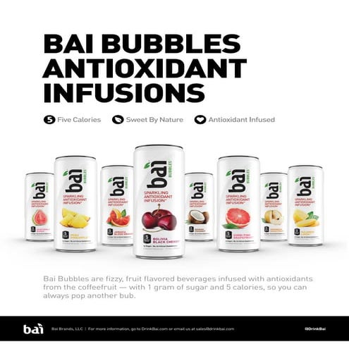 Bai Bubbles® Sparkling Antioxidant Infusion® Peru Pineapple ... The Keurig Dr Pepper product facts website provides the latest nutrition and ingredient information so you can make informed choices. Skip To Main Content. Visit KeurigDrPepper.com. Product Facts. Our Products. Browse By Category. Ready-to-Drink; ... Bai Bubbles® Sparkling Antioxidant Infusion® Lambari Watermelon Lime Flavored Antioxidant ...