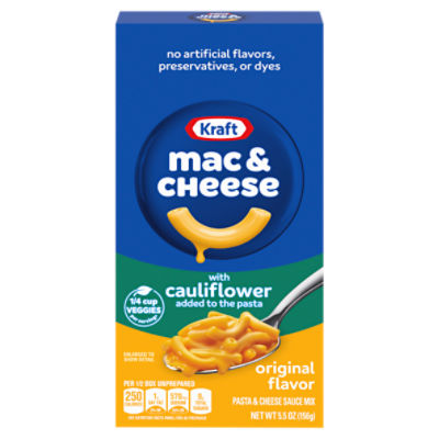 Kraft Original Mac And Cheese Dinner With Cauliflower Added To ... - Target Kraft Macaroni and Cheese Pasta with Cauliflower is a convenient boxed dinner Box includes pasta with cauliflower added and original flavor cheese sauce mix Contains 1/4 cup serving of vegetables per serving and no artificial flavors, preservatives or dyes One box makes about 2 servings Boxed macaroni and cheese is a quick and easy dinner Kraft Original Macaroni & Cheese Dinner With Cauliflower Added To The ... Kraft Macaroni and Cheese with Cauliflower Pasta is a convenient boxed dinner Box includes pasta with cauliflower and original flavor cheese sauce mix Contains 1/4 cup serving of vegetables per serving and no artificial flavors, preservatives or dyes One box makes about 2 servings Boxed macaroni and cheese is a quick and easy dinner Calories in Kraft Macaroni & Cheese with Cauliflower Pasta and ... Kraft Macaroni & Cheese with Cauliflower Pasta Nutrition Facts Serving Size 1 cup (2.5 oz) Amount Per Serving Calories 260 % Daily Values* Total Fat 3.00g 4% Saturated Fat 1.500g 8% Trans Fat 0.000g Cholesterol 10mg 3% Sodium 560mg 24% Total Carbohydrate 49.00g 18% Dietary Fiber 3.0g 11% Sugars 8.00g Includes 0.00g Added Sugars 0% Protein 9.00g Kraft Original Mac N Cheese Macaroni and Cheese Dinner with Cauliflower ... Kraft Macaroni and Cheese Pasta with Cauliflower is a convenient boxed dinner. Box includes pasta with cauliflower added and original flavor cheese sauce mix. Contains 1/4 cup serving of vegetables per serving and no artificial flavors, preservatives or dyes. One box makes about 2 servings. Boxed macaroni and cheese is a quick and easy dinner.